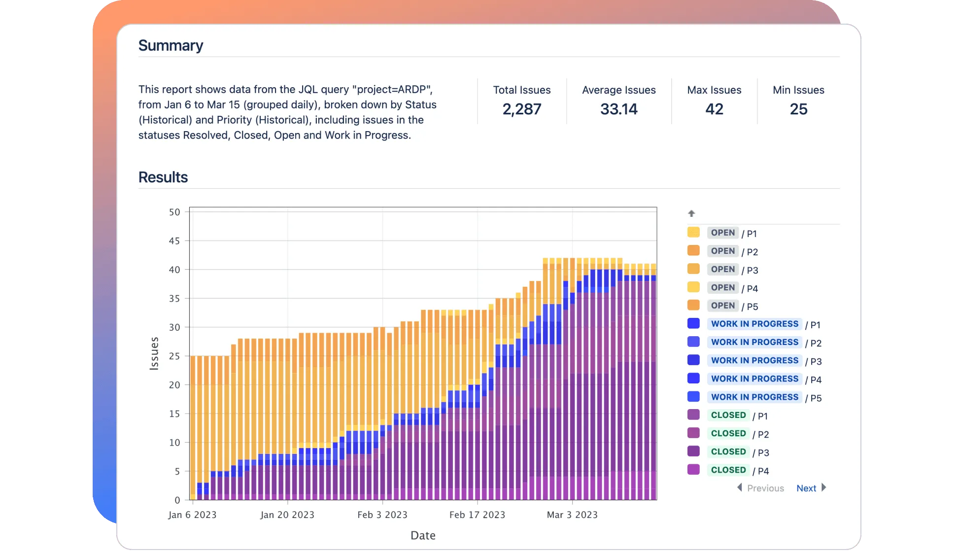 Get data on thousands of Jira issues in seconds, with simple, intuitive report configuration. Add powerful Customizer Scripts to fine-tune results and tailor data visualization.