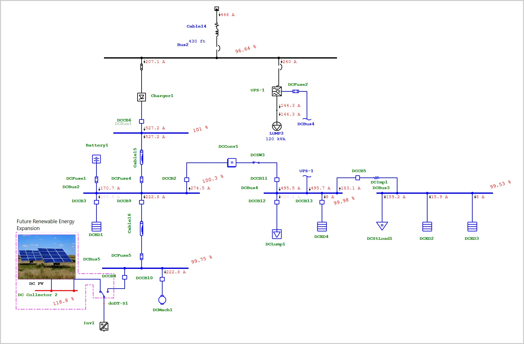 Useful Effective Integrated ETAP DC Load Flow analysis software calculates bus voltage profiles and branch power flows and compares the calculated operating values against bus voltage limits, cable ampacities, and source capacities.