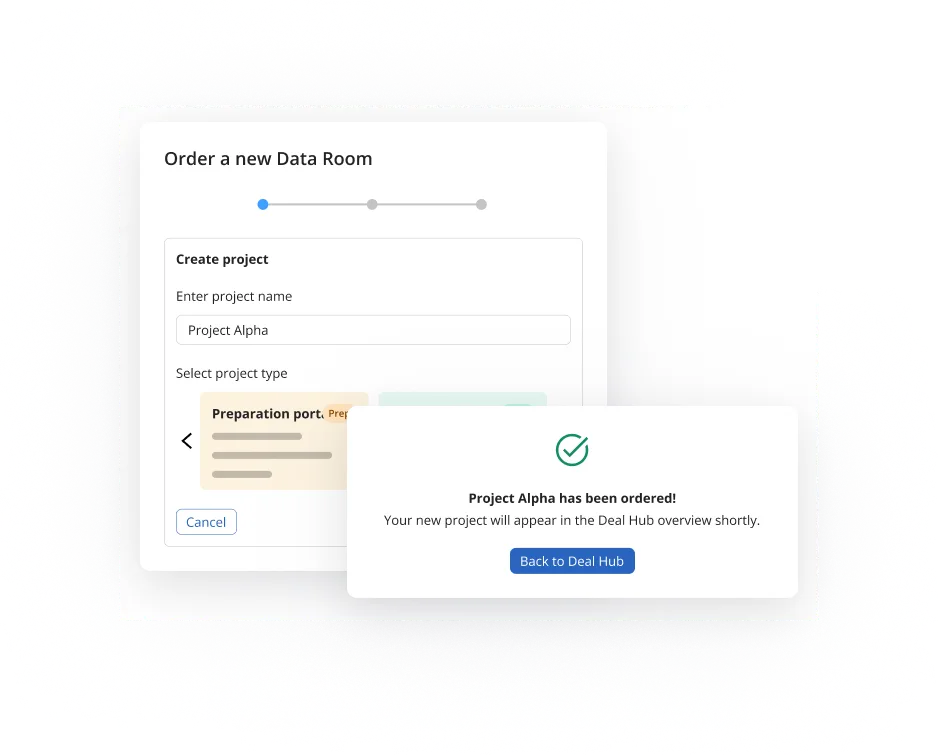 With flexible invoice and pricing options tailored to your needs, Deal Hub lets you open a new virtual data room in a matter of seconds. No sales call required.