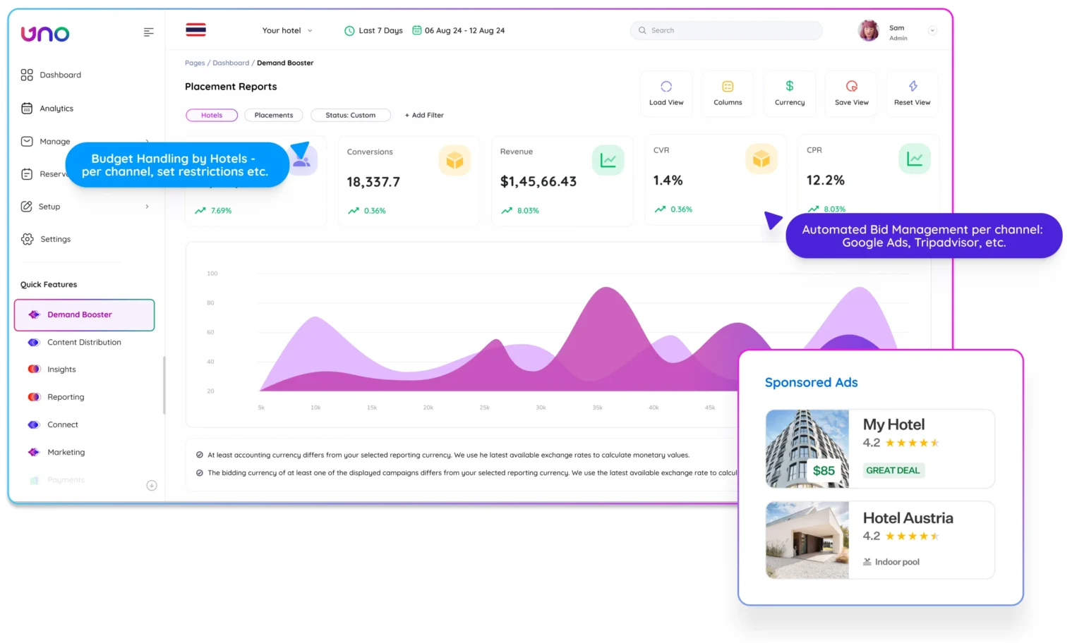 UNO by RateGain enhances hotel paid media campaigns with automated bidding strategies and precision targeting. It optimizes ad spend, increases direct bookings, and provides real-time performance tracking, ensuring maximum return on investment and occupancy.