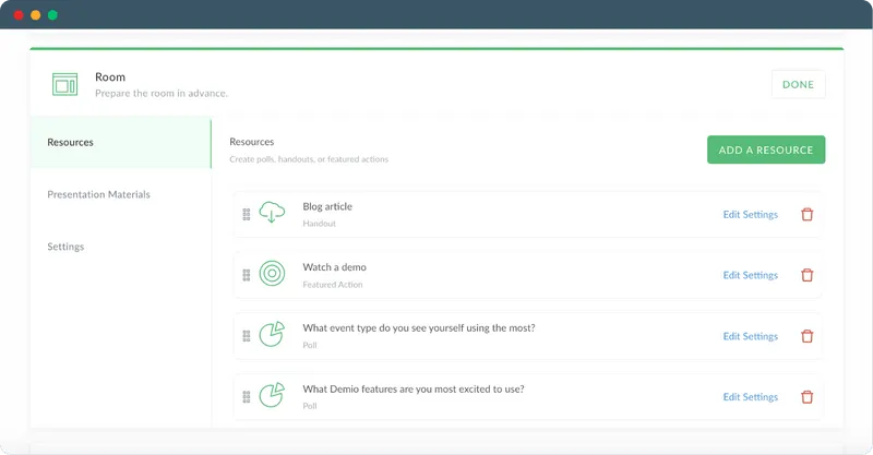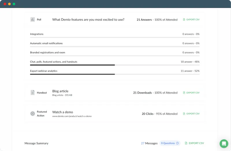 Track exactly who downloaded your handouts, participated in your polls, clicked your featured actions, and drove conversation in your chat. Use your insights to identify attendees who were most engaged during your session. Learn who was most focused during your session (and who was nodding off), to help you understand which attendees prioritize in your post webinar campaigns. Integrate Demio’s webinar data with your marketing automation platform (or CRM) to drive your engaged attendees to the next step in their buyers journey.