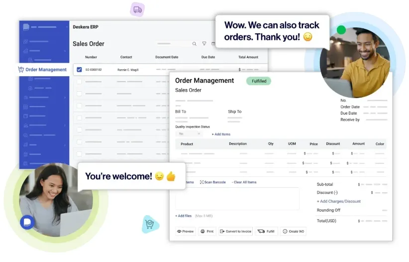 Automate and centralize business processes, gain real-time insights and increase business control, increase data accuracy, reduce costs, fulfill orders, and improve customer service with Deskera ERP.