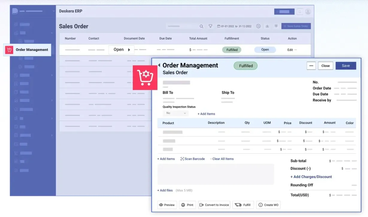 Deskera Order Management, part of Deskera ERP, provides a centralized platform to manage all aspects of customer orders across multiple sales channels. It supports order creation, fulfillment, inventory tracking, shipping, invoicing, and returns. Designed to streamline operations and improve customer satisfaction, the system automates key processes and integrates seamlessly with eCommerce platforms and marketplaces.