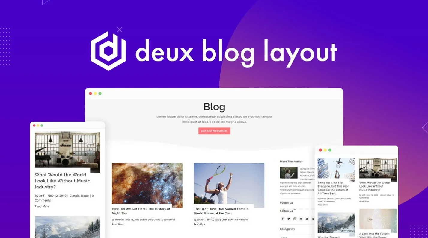 A stylish Divi blog page layout that you can easily apply on your website using Divi Library or Theme Builder. Provide your website’s visitors an attractive & beautiful place to look for your latest updates and blog posts. With extra clarity, visibility & readability, it has adequate space between blog posts, meta descriptions: includes author name, date, category and comments; read more link, and a nicely designed subscribers form. All these features of Deux make it a favorable category blog layout for your website.