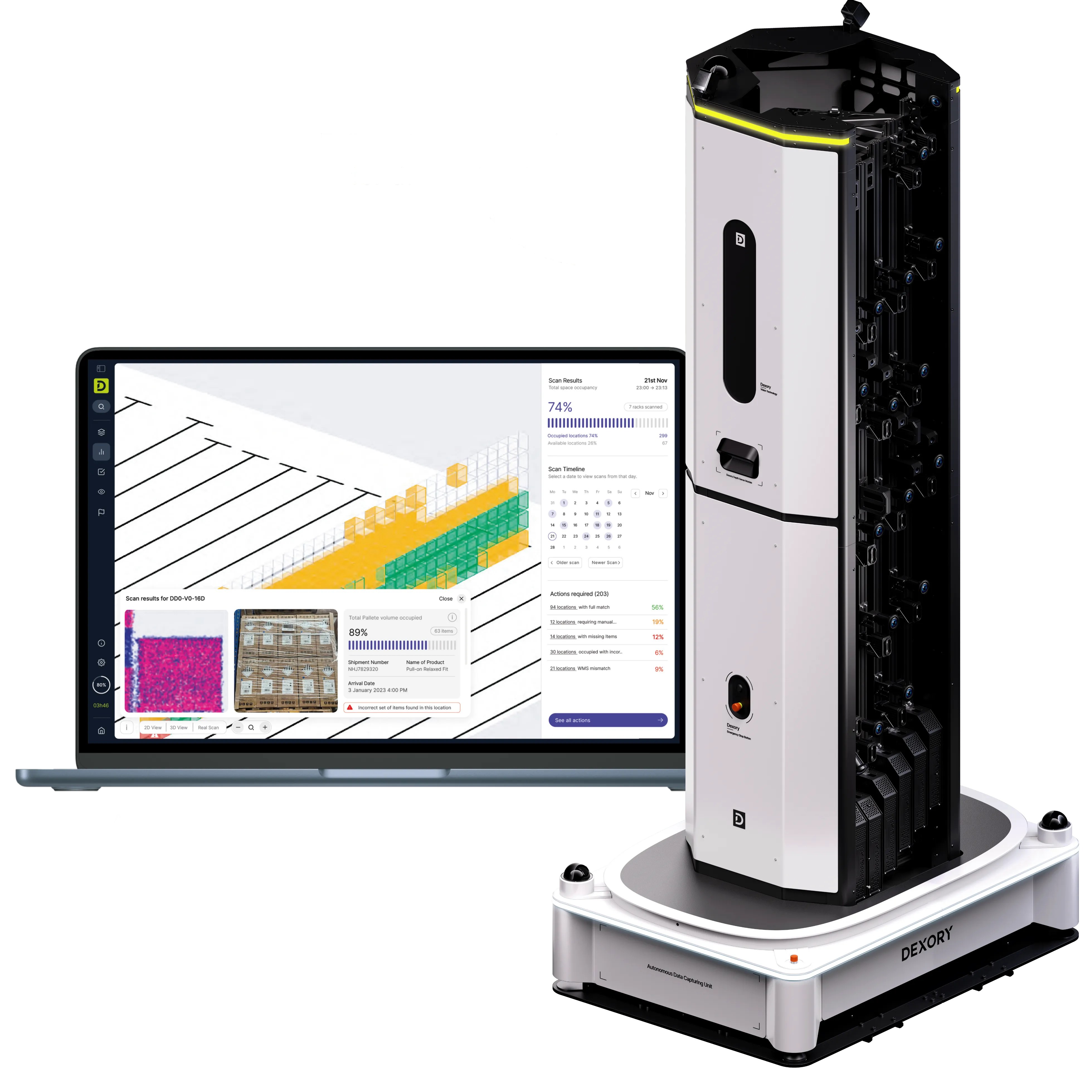 - Autonomous Scanning Robots: Capture high-definition scans of over 10,000 locations per hour, including racks up to 14 meters high.