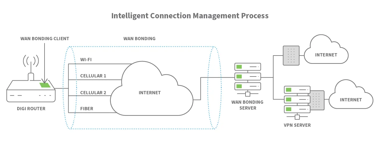 Digi WAN Bonding combines multiple connections into a seamless and resilient connectivity solution that ensures optimal performance and maximum uptime anywhere around the world. Digi devices provide a range of connectivity options including cellular failover with features such as Digi SureLink®, policy-based routing and interface bonding. These features are excellent at preventing any external network failures from causing downtime. When one or many cellular connections are used across a network, they are vulnerable to the disruptions inherent to wireless communication. Digi WAN Bonding provides a valuable addition beyond failover by aggregating multiple connections to maximize speed and throughput, reduce latency and seamlessly optimize performance. This service provides continuous, intelligent optimization even in moving vehicles. Digi WAN Bonding combines multiple cellular and wired connections to deliver the lowest latency of the bonded interfaces, along with resilient and seamless handover, and a throughput representative of the combined interfaces.
