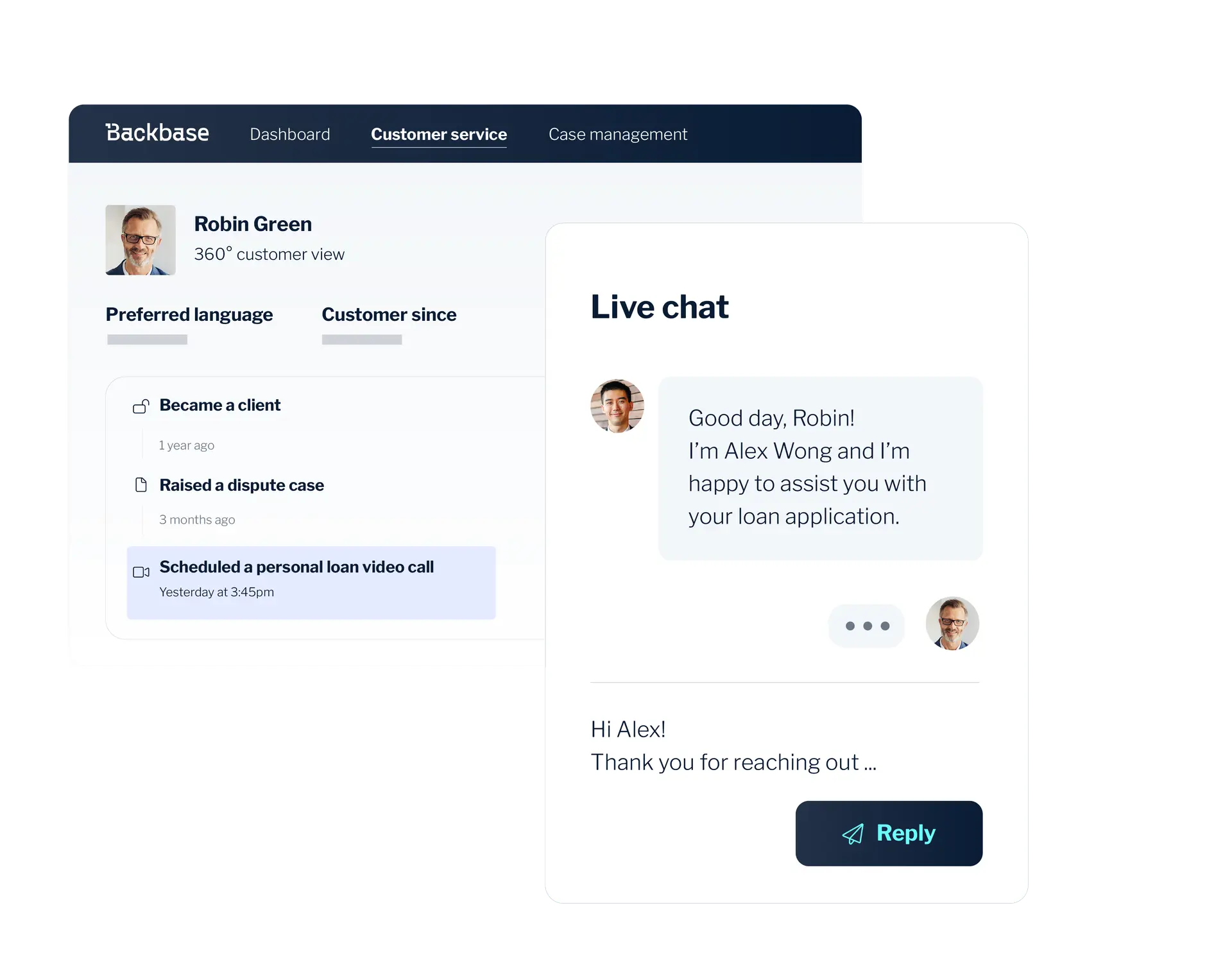 Fewer applications, more productivity Merge all available customer data into a single app. That means more time for your employees to quickly resolve issues and personalize customer service. Backbase Digital Assist comes with a 360° customer case view, dispute management, real-time communication, up-sell smart insights, permissions, entitlements, and so much more!