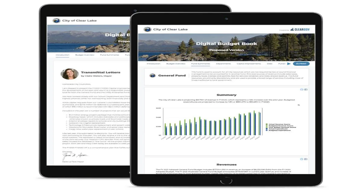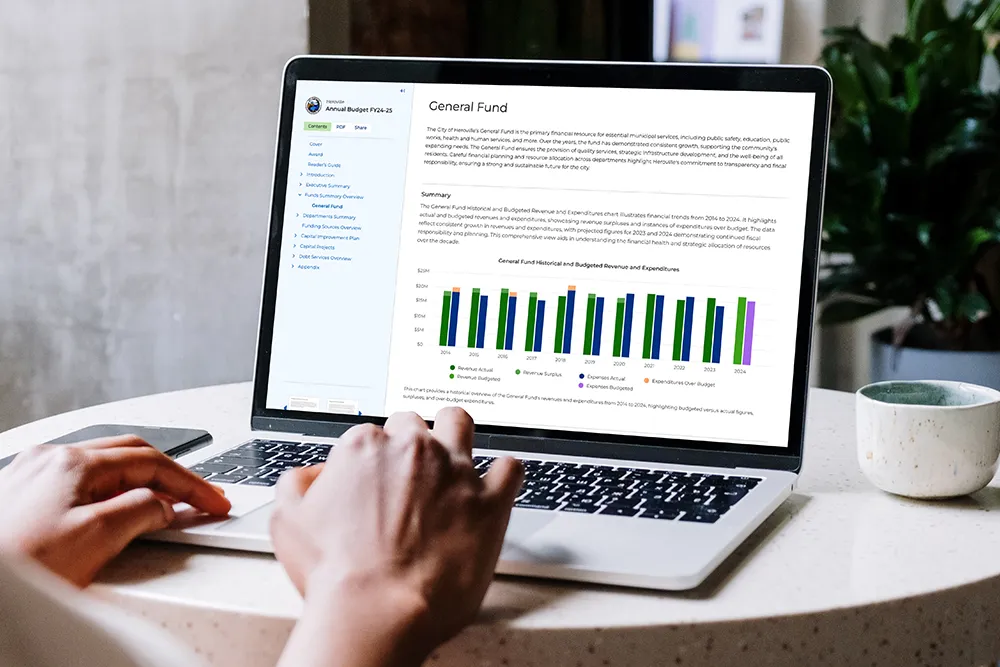 ClearGov Digital Budget Book is a cloud‑based solution that enables public sector organizations to build modern, interactive, and easy‑to‑navigate budget books without the manual effort of traditional document creation. It streamlines the entire publishing process with templates, automation, and visual tools, allowing finance teams to present complex budget data clearly and engagingly.