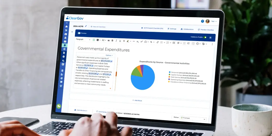 ClearGov Digital Financial Reporting is a cloud‑based solution that helps public sector organizations create modern, easy‑to‑understand financial reports without the complexity of traditional manual processes. It streamlines the creation of annual financial statements, budget books, and audit‑ready reports by combining structured templates, automation, and interactive presentation tools. The platform improves accuracy, accelerates reporting cycles, and enhances transparency for both internal stakeholders and the public.