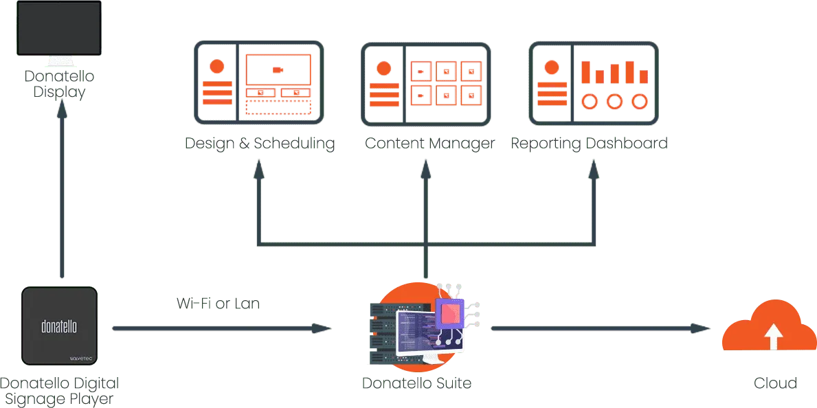 Wavetec Digital Signage, powered by the Donatello Suite, is an advanced visual communication platform designed to deliver dynamic, interactive content across multiple customer touchpoints. It combines high-quality displays, robust media players, and centralized content management software to create engaging experiences that inform, entertain, and influence customer behavior in real time.