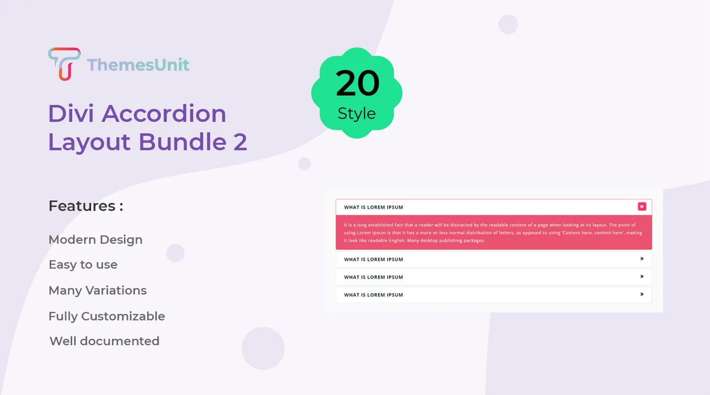 Bundle of stylish accordion layouts for Divi, perfect for FAQs, feature lists, and content toggles.