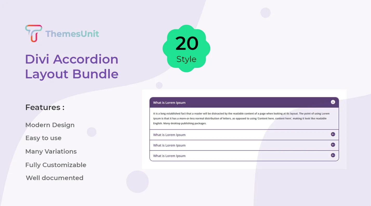 Stylish accordion layout bundle for Divi, perfect for FAQs, service details, and interactive content sections.