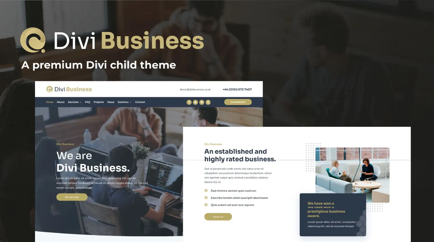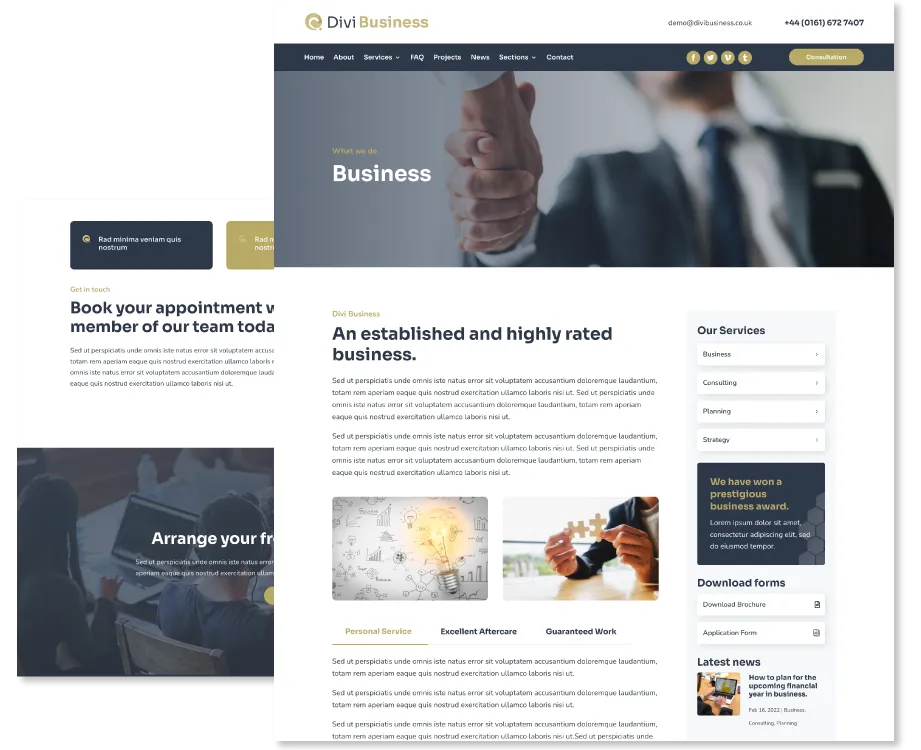 Divi Business is a premium multipurpose child theme that is suitable for almost all kinds of businesses, small and large. A sleek and modern design with everything you need to build your next website.