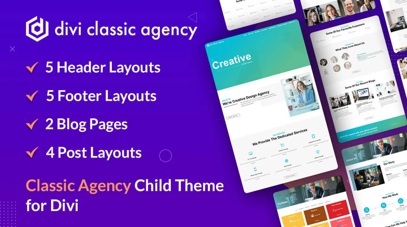 Elegant Divi child theme for creative and digital agencies with sleek layouts and conversion-focused design.