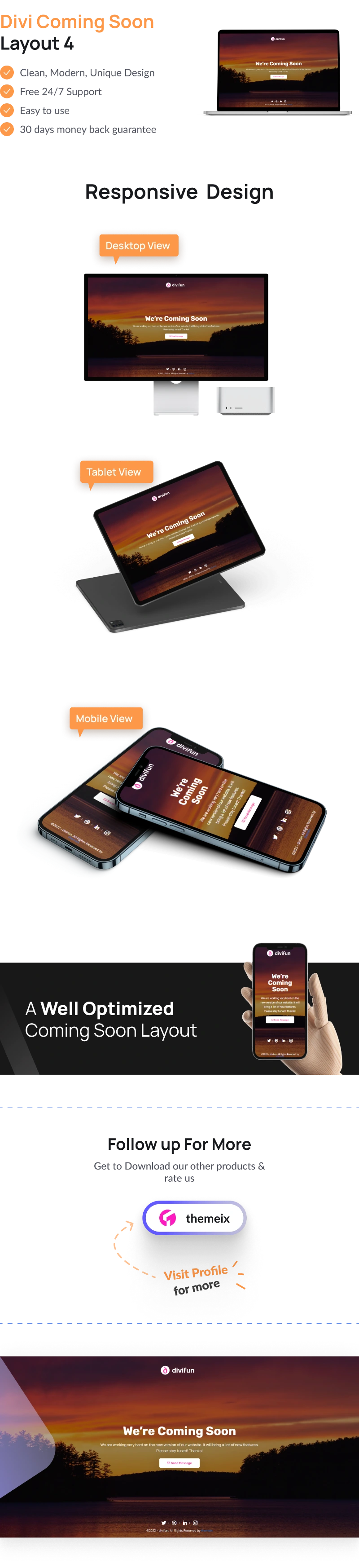 Divi Coming Soon Layout 4 is part of the free Divi Coming Soon Pages Layout Kit, designed to help you build anticipation for upcoming websites or product launches. It features a clean, modern design with customizable sections, countdown timers, and responsive formatting. Ideal for startups, agencies, or personal projects preparing for launch.