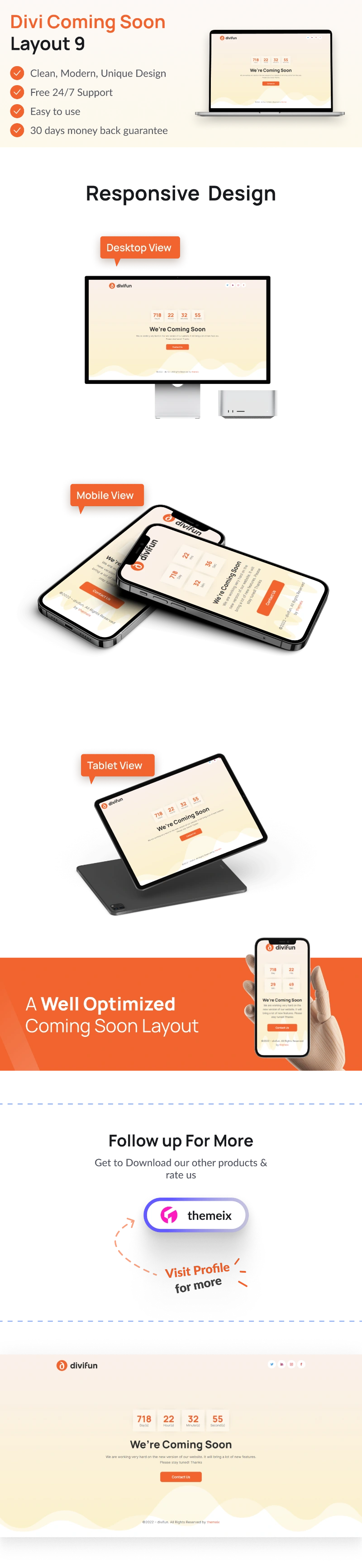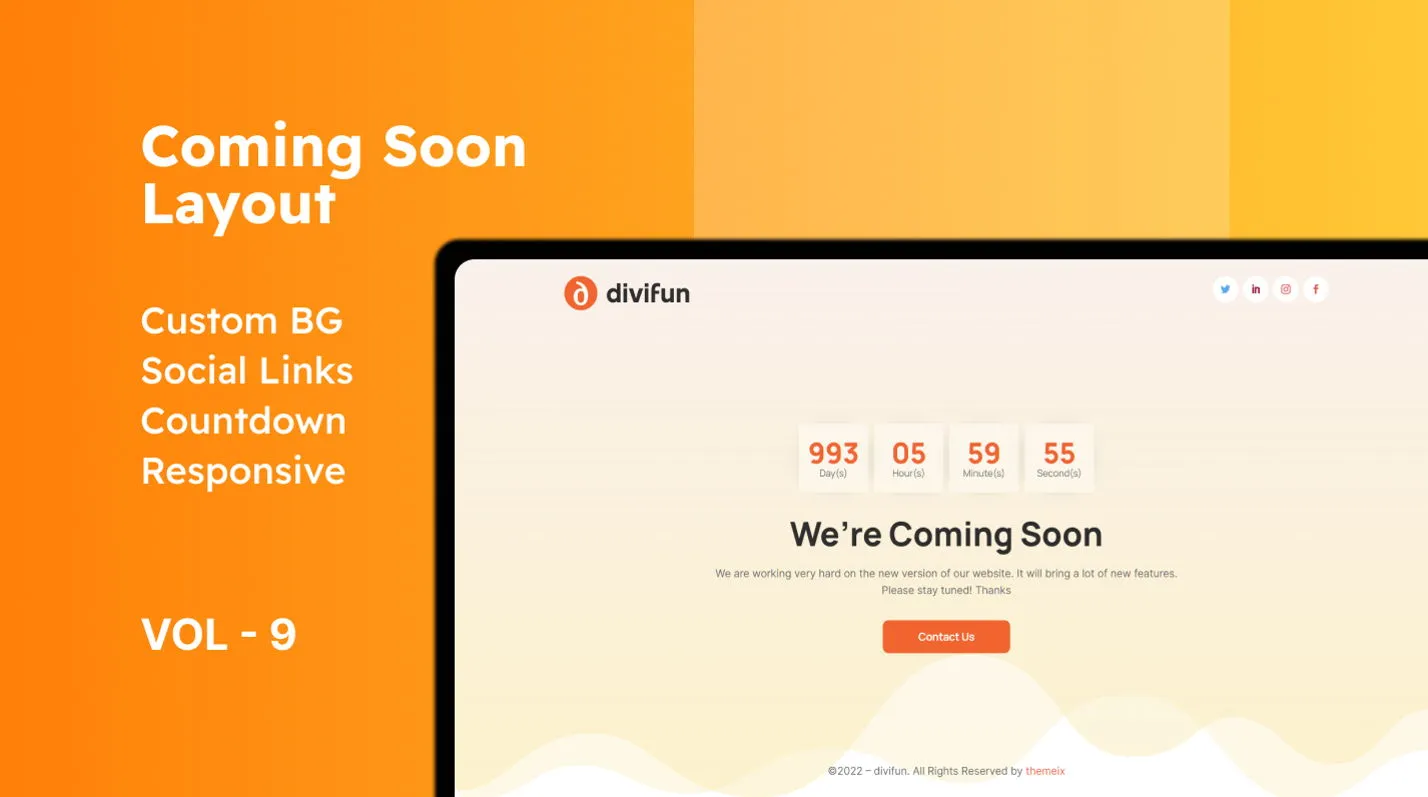 Stylish Divi layout for coming soon pages with countdown timer, gradients, and responsive design for under-construction sites.