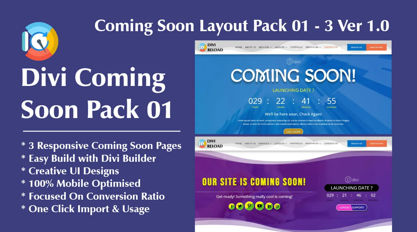 You will get a responsive modern coming soon layout design with ready to use for your projects using Divi Builder. It can easily customization for any projects using the Divi theme builder. It also gives Infinite possibilities with no limitation of design, really to use it with extreme responsive UI Design. All coming soon layout page designs focused on conversion with users, with one-click import and easy to use. You just need to Import in your Divi Theme Builder and enjoy.