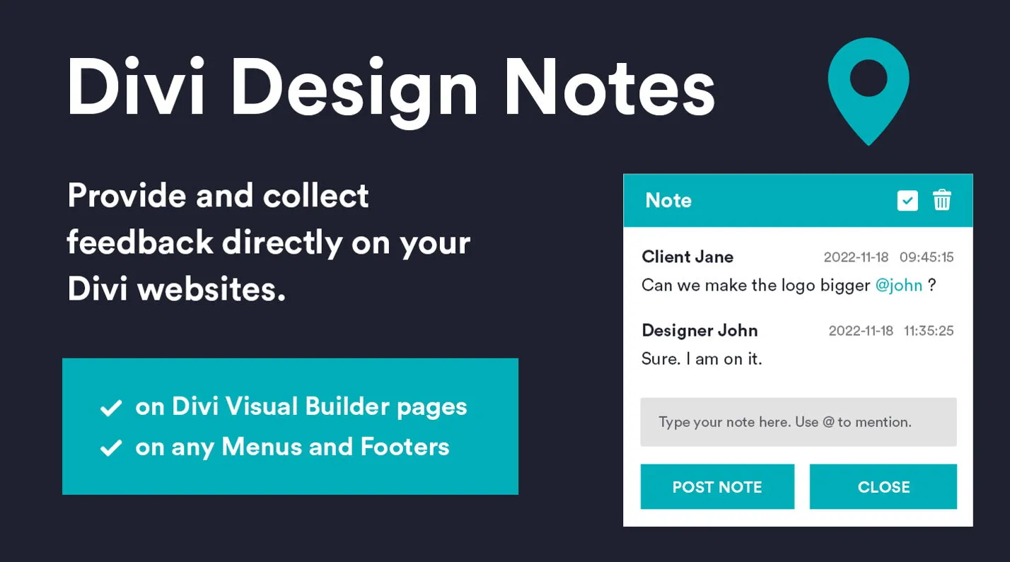 Improve your collaboration efforts and communicate effectively with your clients and colleagues by pinning Notes to specific elements of your design on the front-end of your website. Divi Design Notes gives you the ability to pin, point and comment any part of your Divi design directly on your Divi website. This will save you tons of time emailing backwards and forwards with your clients and endless design editing discussions. Now you can have a faster project turnaround by reducing excess time spent in meetings to refine and complete websites faster.