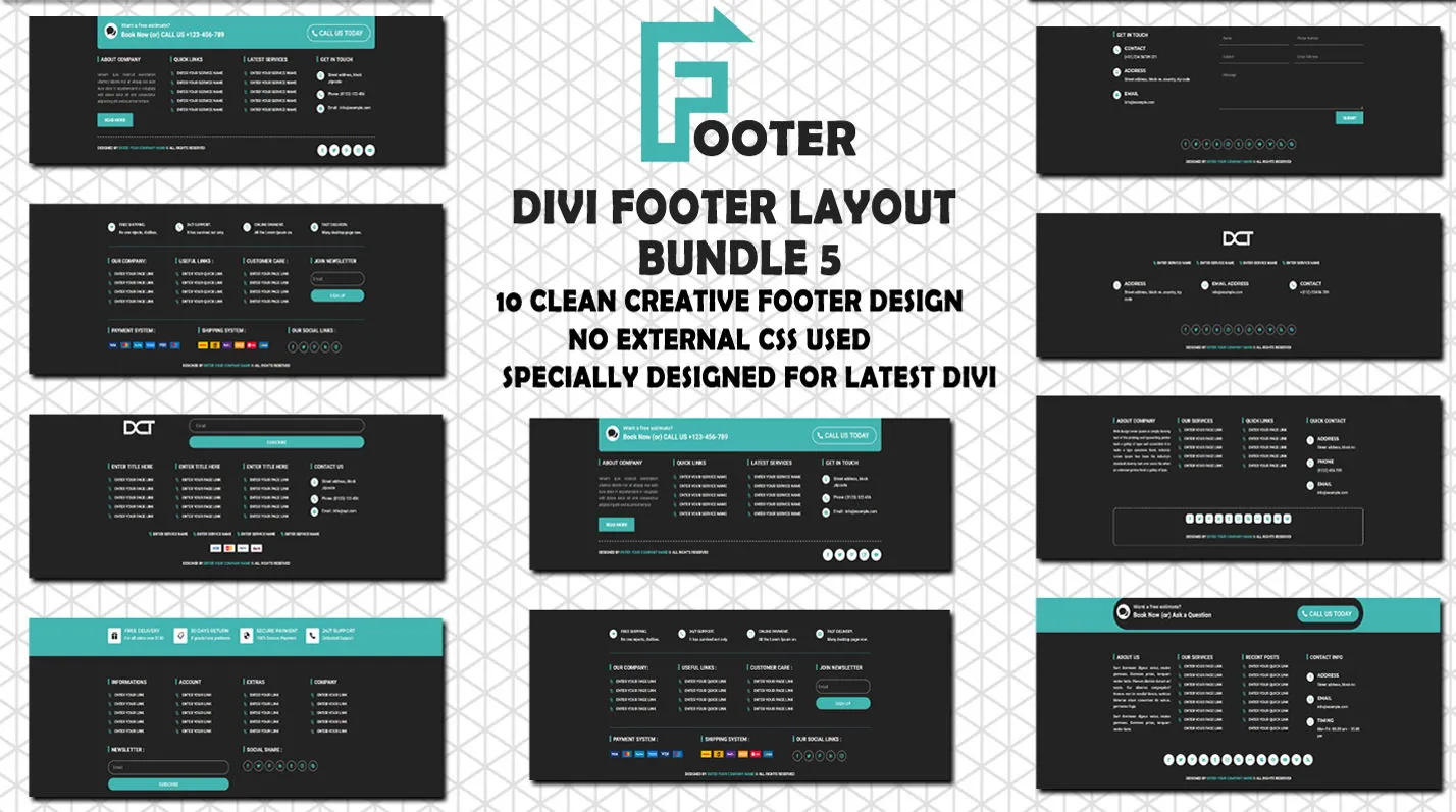 Bundle of 5 premium Divi footer layouts with modern design, easy customization, and responsive performance.