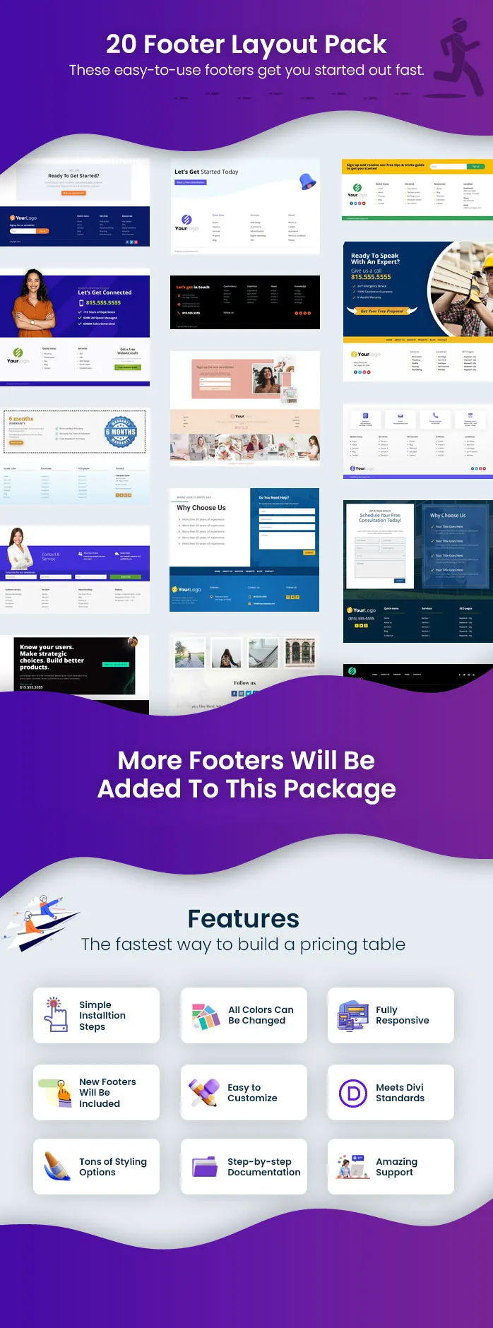 Customize your website with 80+ modern and eye-catching footer layouts using the Divi Footers Pack.