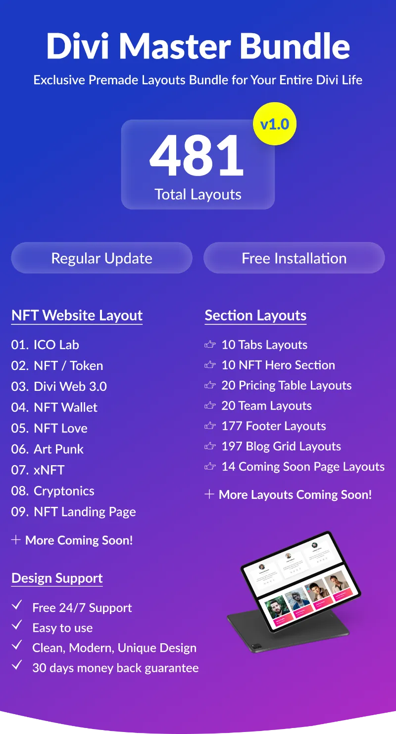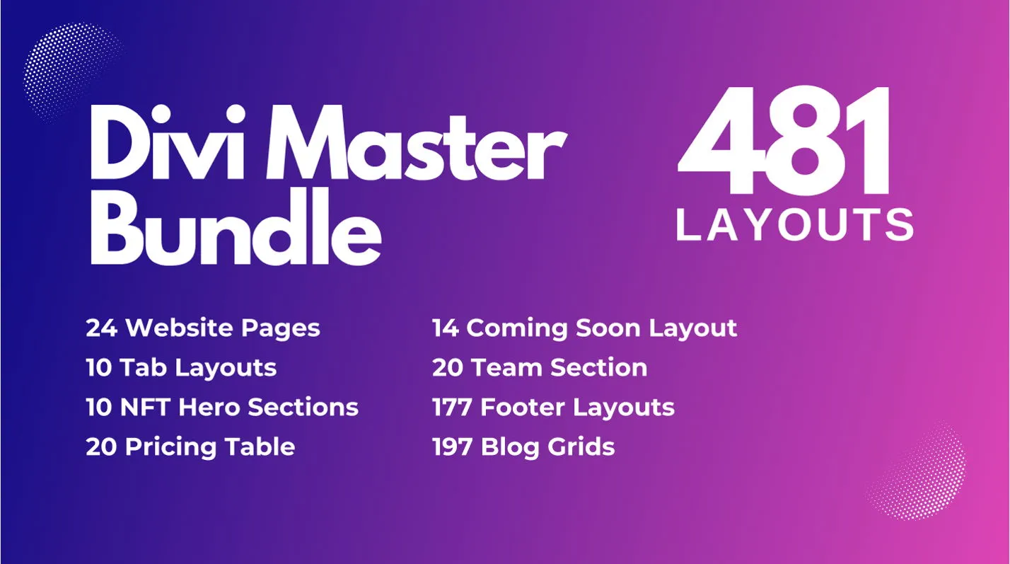 Divi Master Bundle comes with 481 ready-made Divi layouts with 10 Tabs, 10 NFT Hero, 20 Pricing Table, 20 Team Section, 177 Footer, 197 Blog Grid, 14 Coming Soon Page layout included. Each layout comes with a beautiful pre-made website.