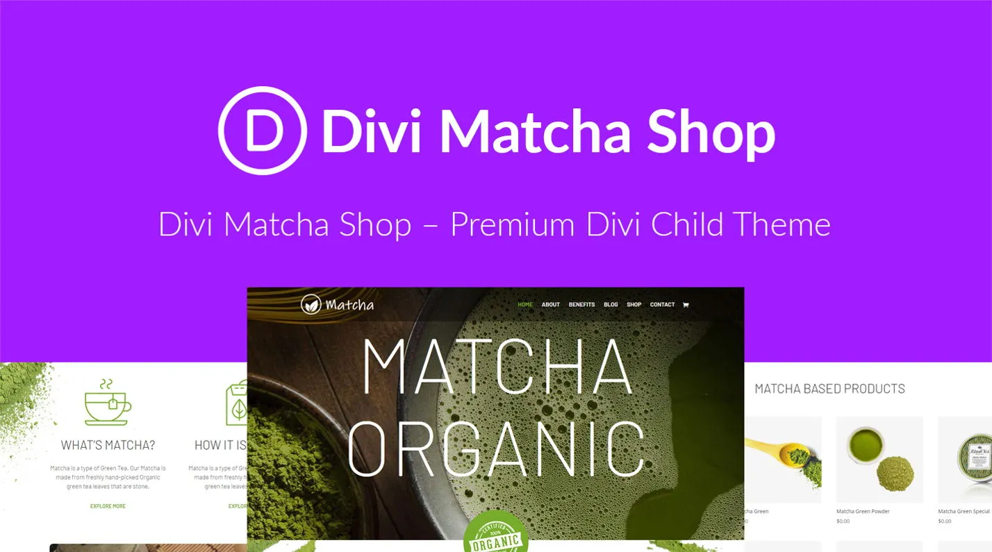 Divi Matcha Shop is a clean and minimal child theme designed for matcha and specialty tea businesses. It features WooCommerce-ready pages, a modern homepage with animated elements, and simplified layouts for blog, contact, and product benefits. Ideal for small businesses looking to create a visually appealing and functional online store with Divi.