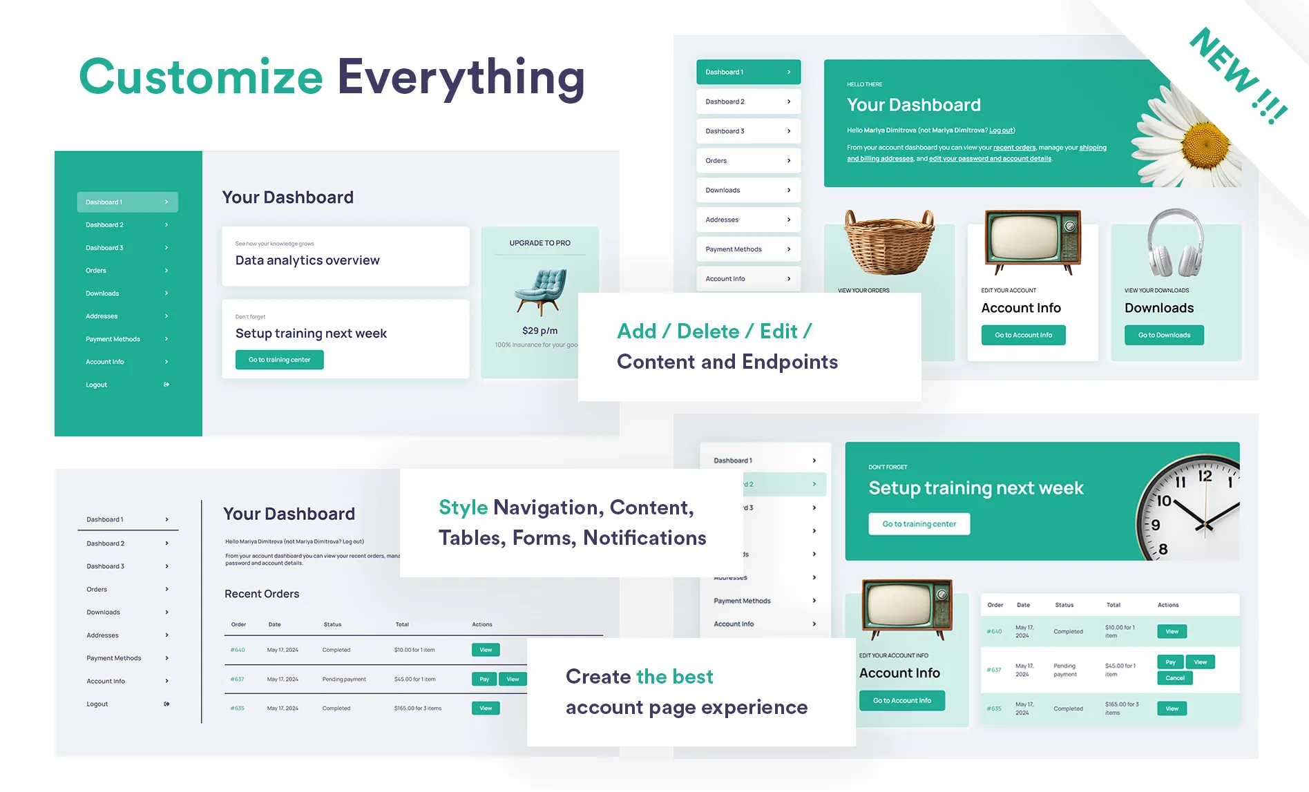 Divi My Account Page is a great tool to improve your customer’s shopping experience by making your store’s “my account” page more usable, modern and appealing. Style every part of the account page from Content to Endpoints, Tables, Forms rigth down to making your own custom endpoints and assigning user roles to them. Add sections suited to your business and audience. Promote products and showcase promotions. Add role-specific endpoints to offer role-specific promotions. Style every part of the account page to match your business vibe and brand.