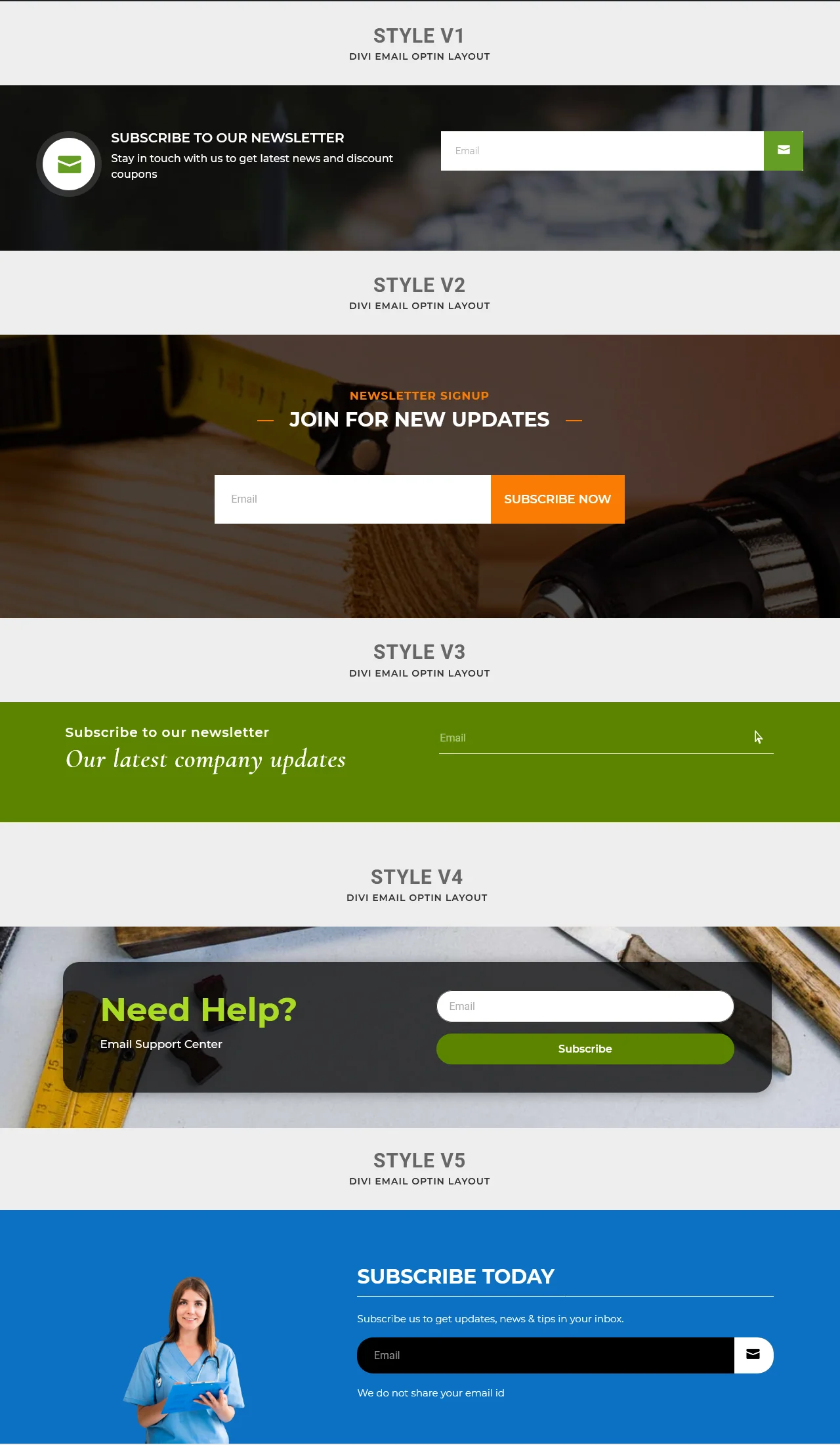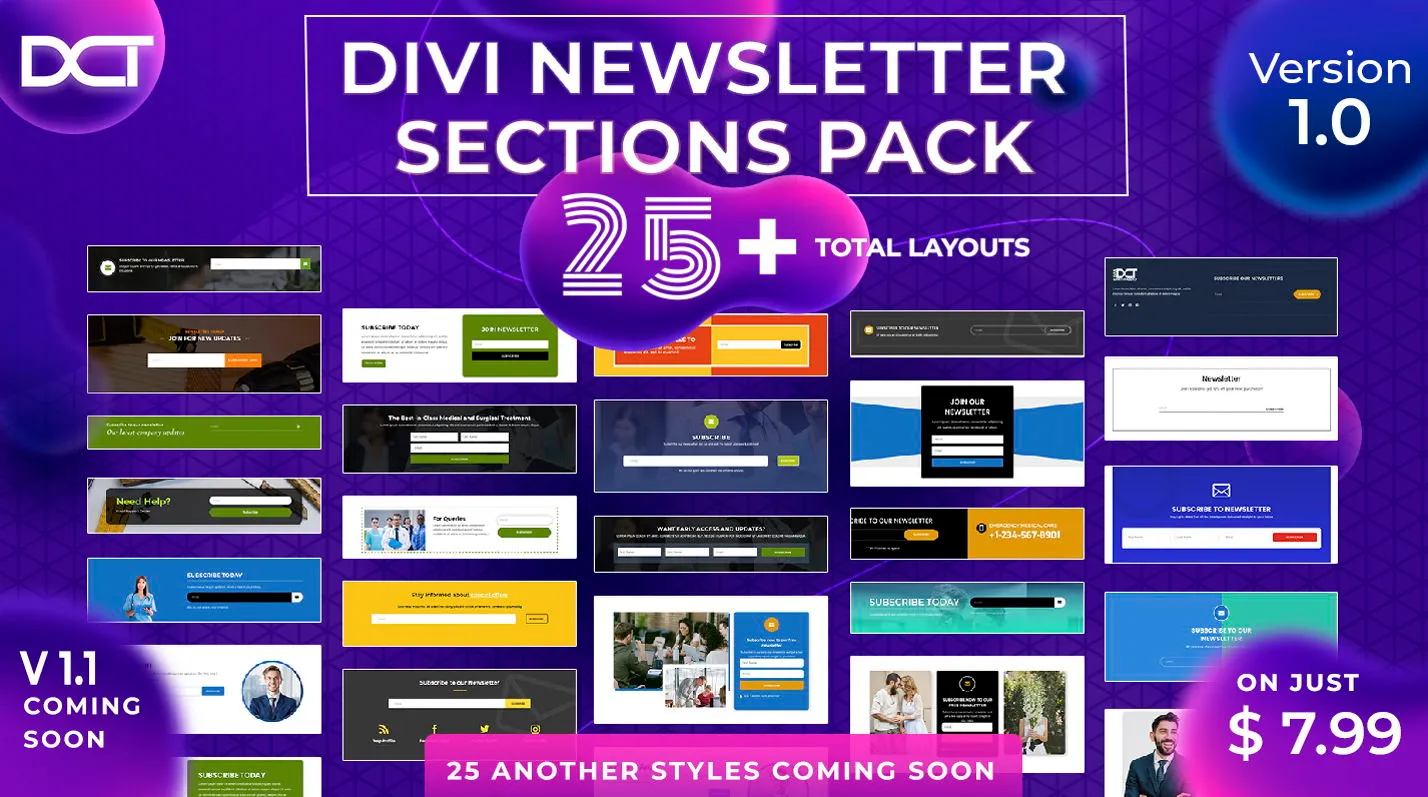 A collection of responsive newsletter opt-in sections for Divi, designed to boost email signups and engagement.
