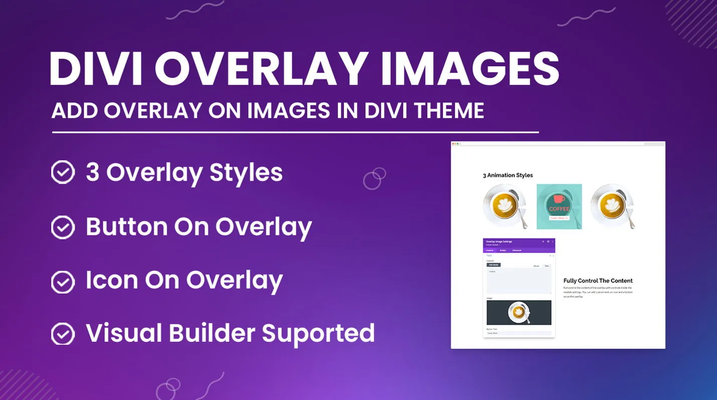 - No Coding Needed: Easily configure overlays using Divi’s visual builder.