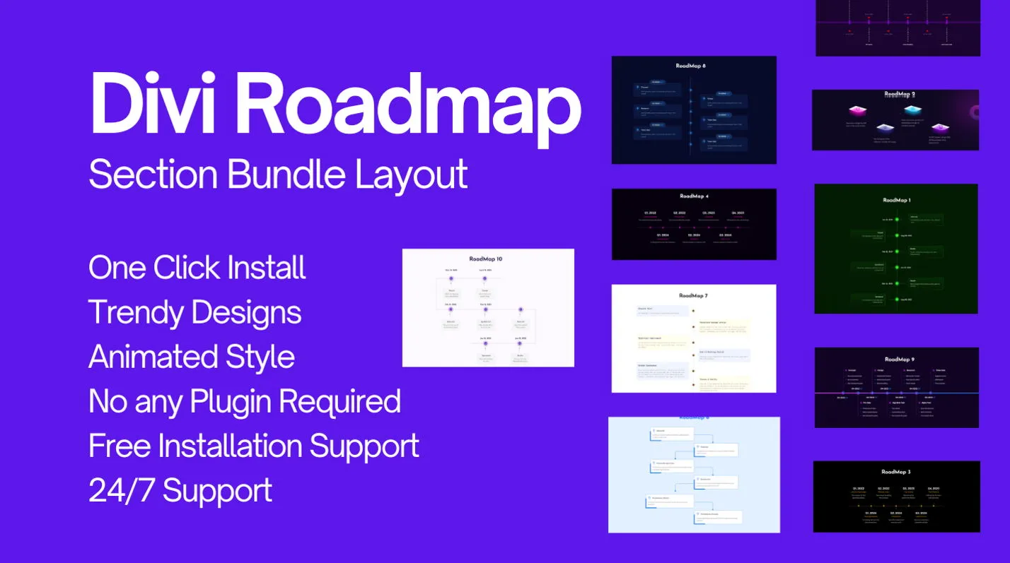 The Divi Roadmap Section Bundle Layout is a collection of customizable, pre-designed sections for the Divi theme on WordPress. These sections can be easily added to any page or post on your website and include a variety of styles and designs, such as timelines, roadmaps, and feature lists. The bundle includes a total of 6 unique layouts, each fully responsive and customizable to match your brand. They can be imported directly into the Divi Builder, saving time on the design process.