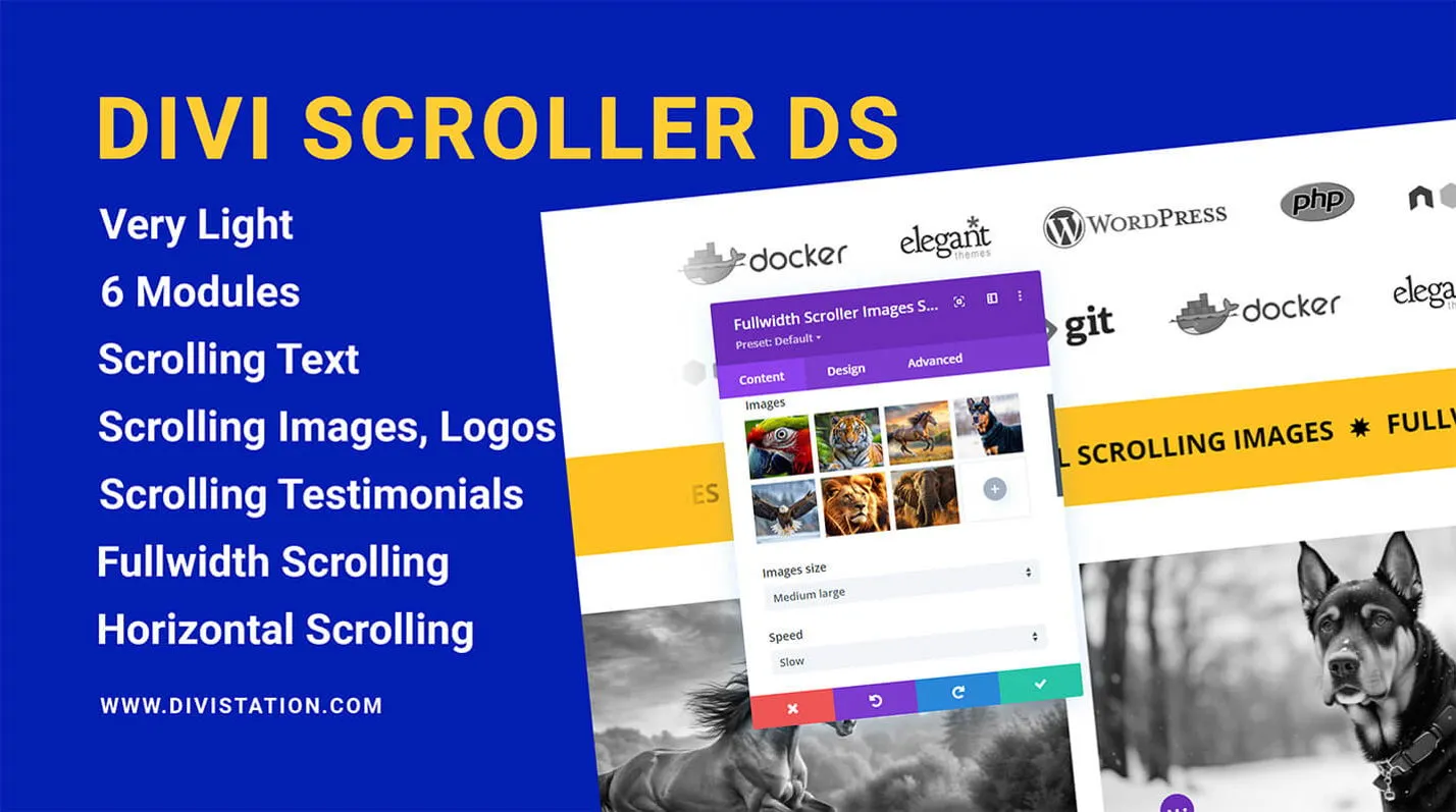 “Divi Scroller DS” is a Divi theme extension that enables users to easily create smooth horizontal scrolling text, images/logos and testimonials, enhancing website interactivity and visual appeal.