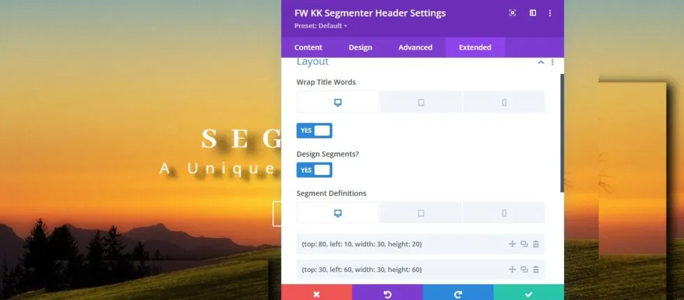 The KK Divi Segmentor plugin provides a Fullwidth Module to be used in the Divi Page Builder. The module is modeled using the Divi FW Header module and incorporates some magic offered by codrops. Most of the module controls are included from the model, but uniquely, you can design a pattern or mosaic of rectangular shapes that give a 3d look to the header.
