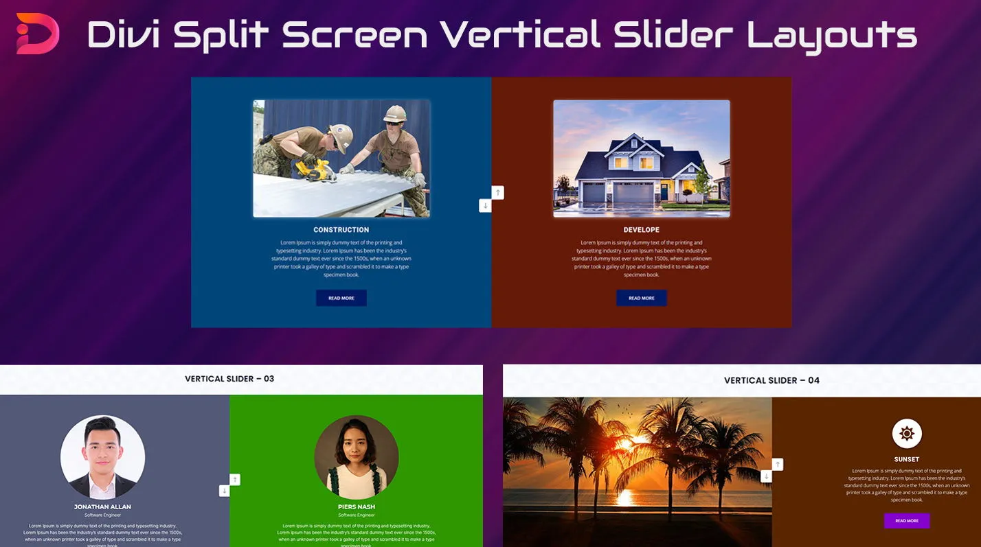 Creative Divi layout pack with vertical sliders and split-screen design for dynamic, modern websites.