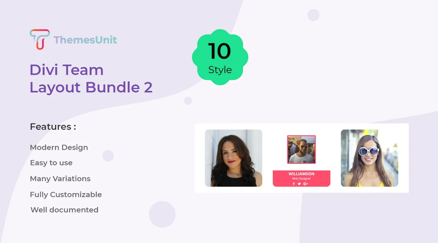 Showcase your team with 10 elegant, responsive layouts designed for Divi websites and easy customization.