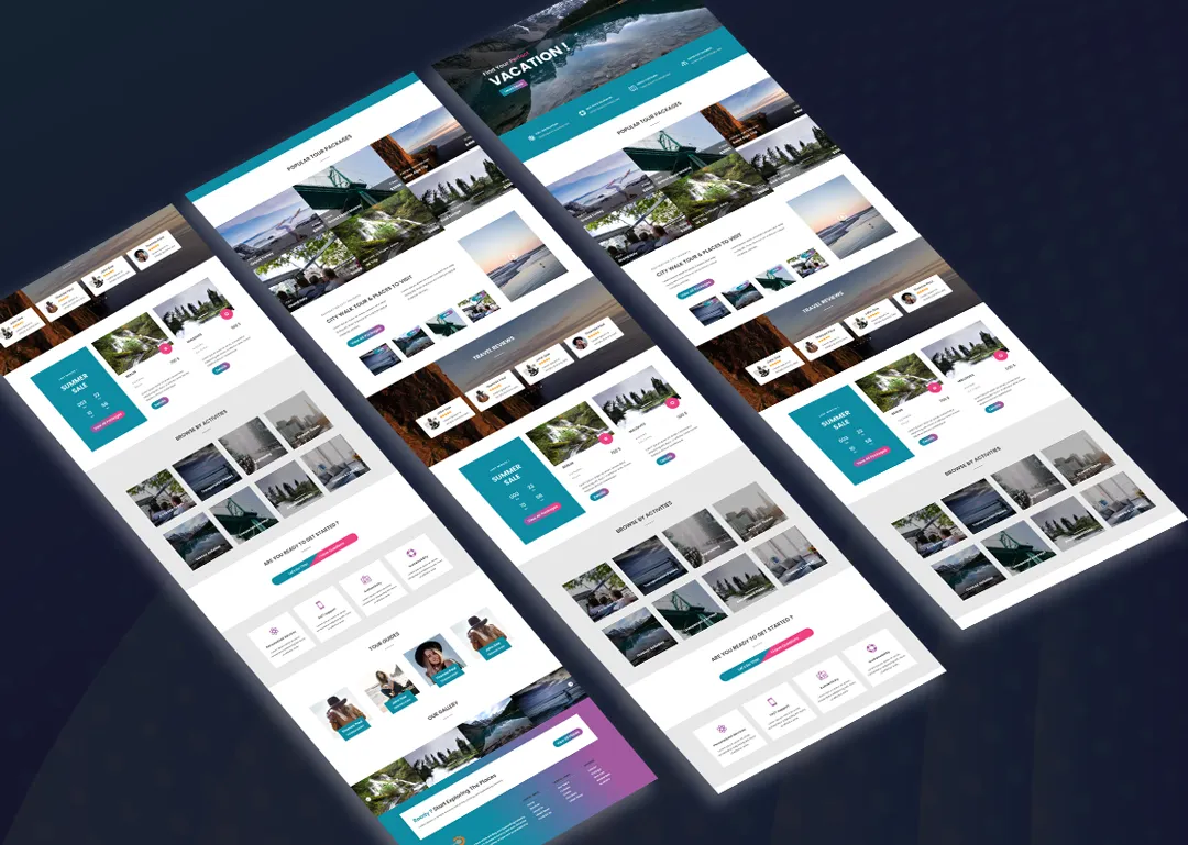 - Destination Highlights: Showcase travel spots with large image sections and descriptions.