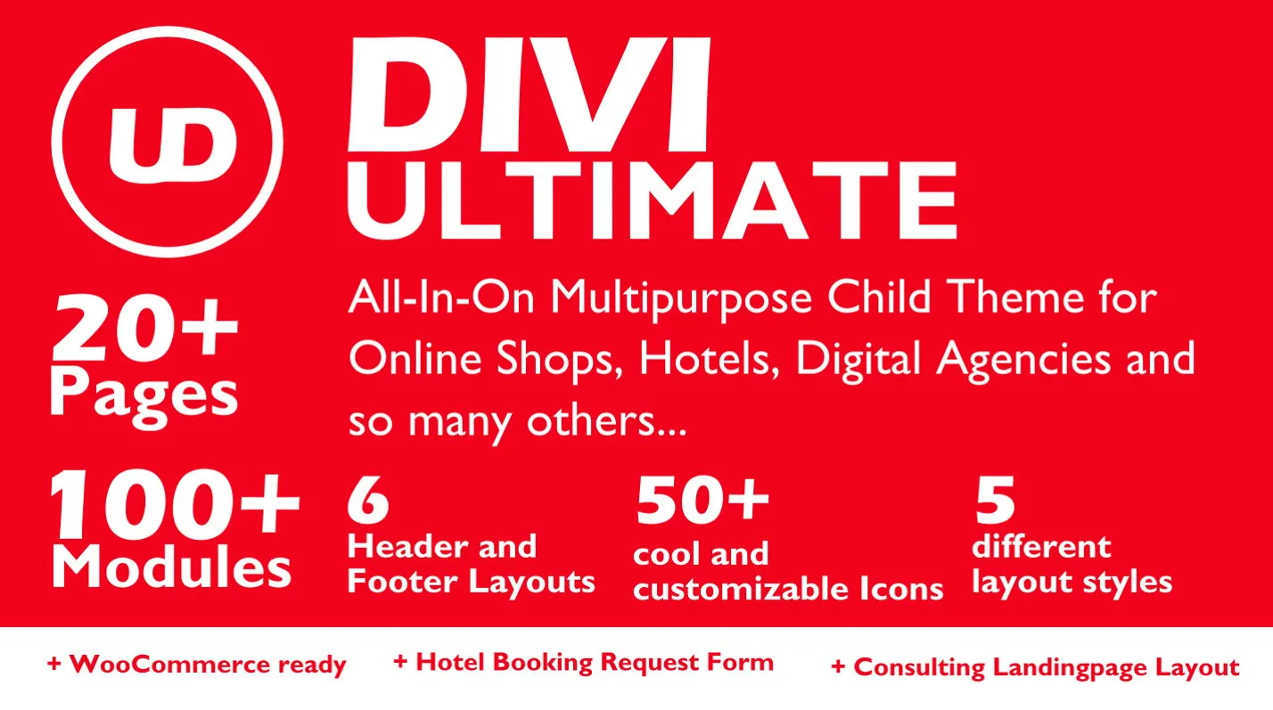 - 4 completely different theme styles for the pages. Divi Ultimate is split into following 4 individual super themes: Divi Ultimate, Divi Ultimate Agency, Divi Ultimate Hotel, Divi Ultimate Online Store which represent those businesses and characters.