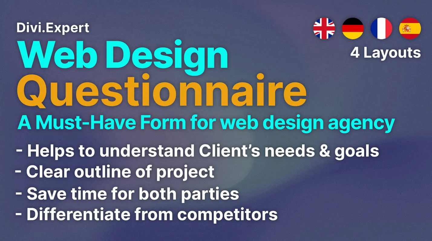 Introducing Divi.Expert’s Web Design Questionnaire Form – the ultimate tool for Divi developers looking to create a fully customized website that perfectly meets their client’s unique needs and preferences. Our comprehensive form guides clients through a detailed exploration of their website design vision, covering everything from layout and functionality to content and branding. The questionnaire is available in 4 different languages: English, German, Spanish and French. So you will have 4 diifferent layouts. The information gathered through the questionnaire is then used to create a tailor-made website that truly represents the client’s brand and effectively targets their desired audience. With Divi.Expert’s Web Design Questionnaire Form, creating a website that truly stands out has never been easier.