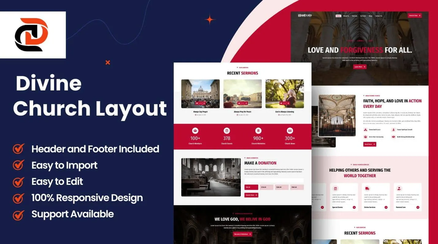 Divine Church Layout is a modern ready-to-use designed for churches, mosques, prayer groups, charity, volunteering, and non-profit organizations. It has a simple, contemporary, and clean design with a 100% responsive layout, and it is very easy to customize using Divi Page Builder.