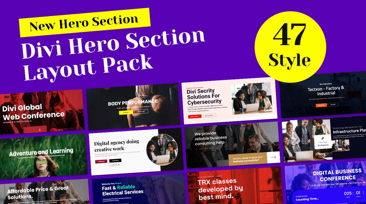 Stylish Divi layout pack with multiple hero section designs for impactful first impressions and branding.