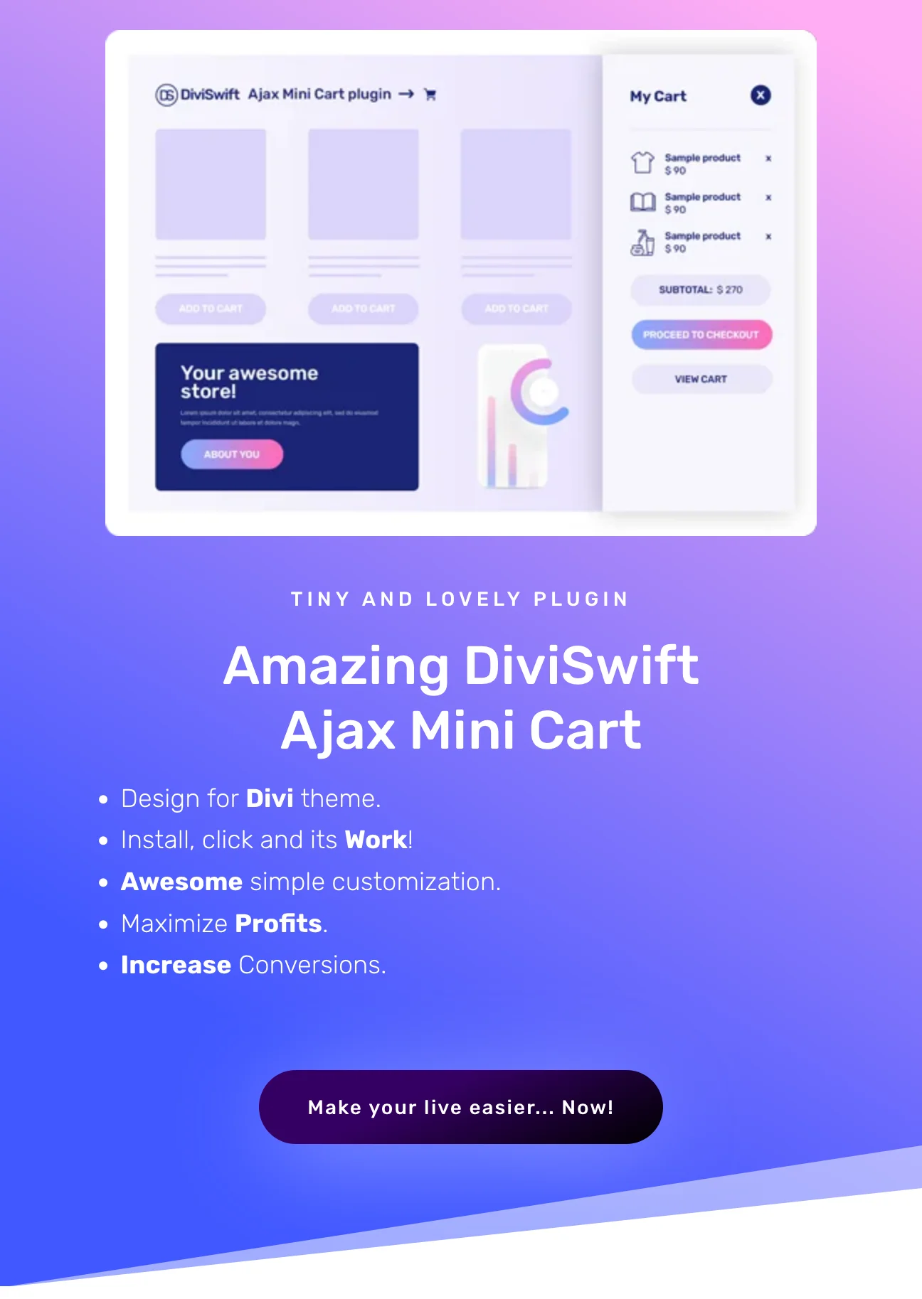 DiviSwift Ajax Mini Cart is a powerful plugin designed to improve the shopping experience on your WooCommerce store. It offers a seamless and interactive mini cart that updates in real-time, ensuring a smooth and efficient checkout process for your customers.
