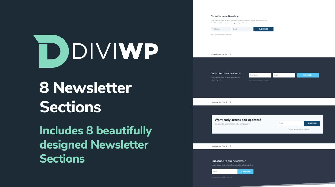 Premium newsletter sections for Divi with modern design, responsive layout, and easy customization.