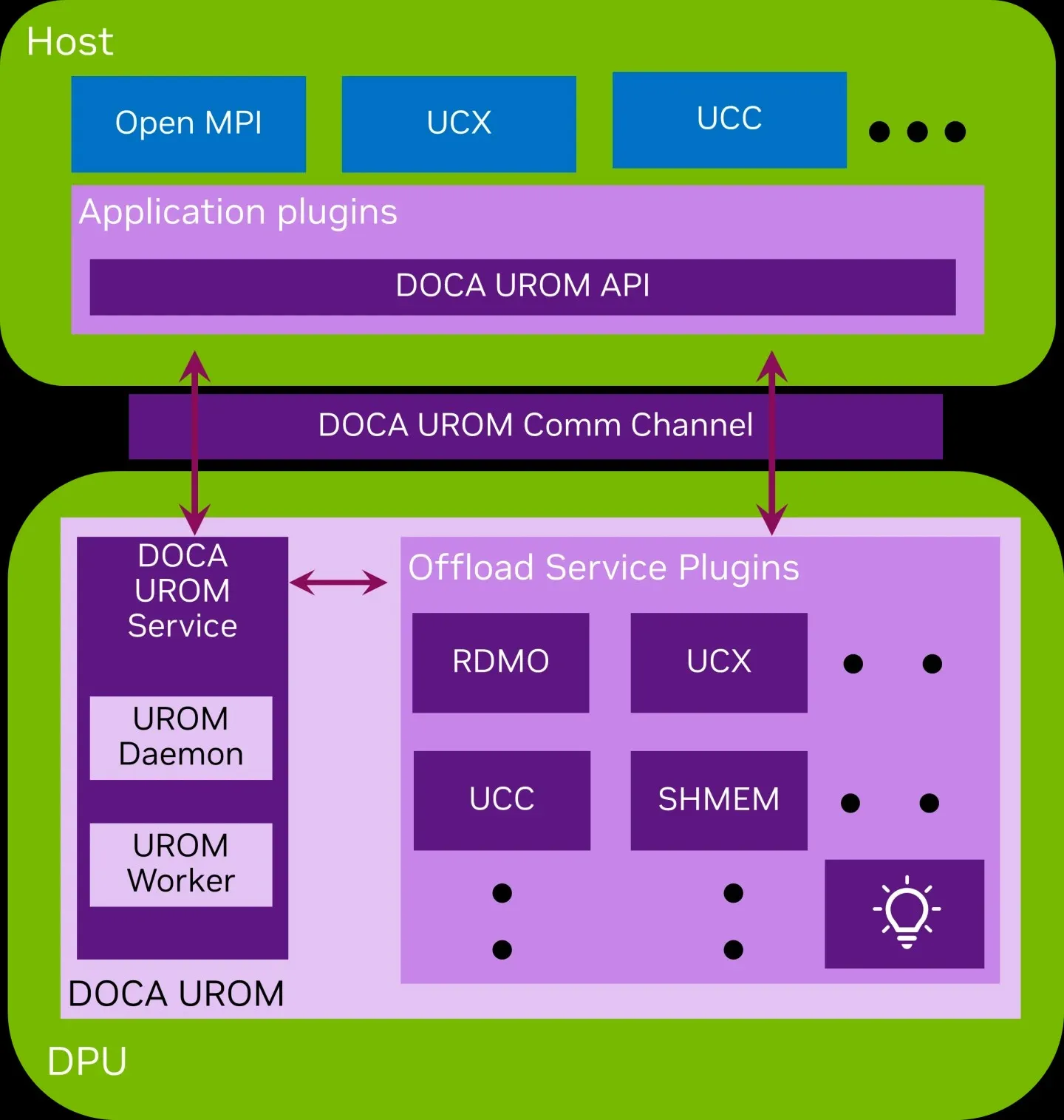 DOCA UROM offloads High-Performance Computing computations from the host to the DPU, managing resources and workers.