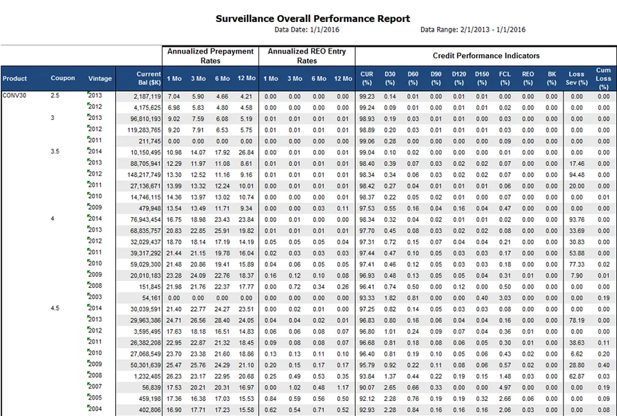 - Comprehensive Reporting: Includes detailed reports on data exceptions, collateral and loan performance, losses, and REO metrics.