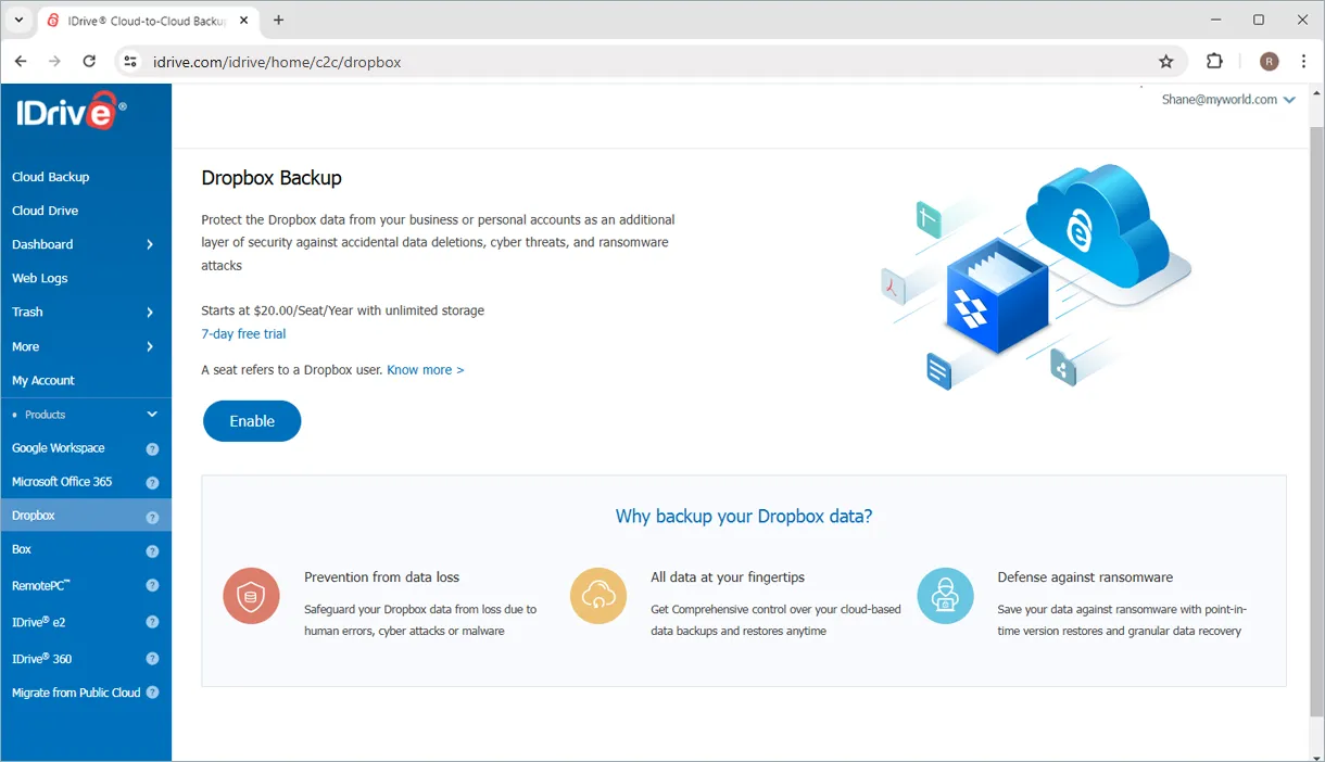 Add an extra layer of security to your Dropbox Drive and Team folders’ content with IDrive Dropbox Backup. Keep your data accessible and recoverable with daily automatic backups up to three times in an encryption-protected cloud.