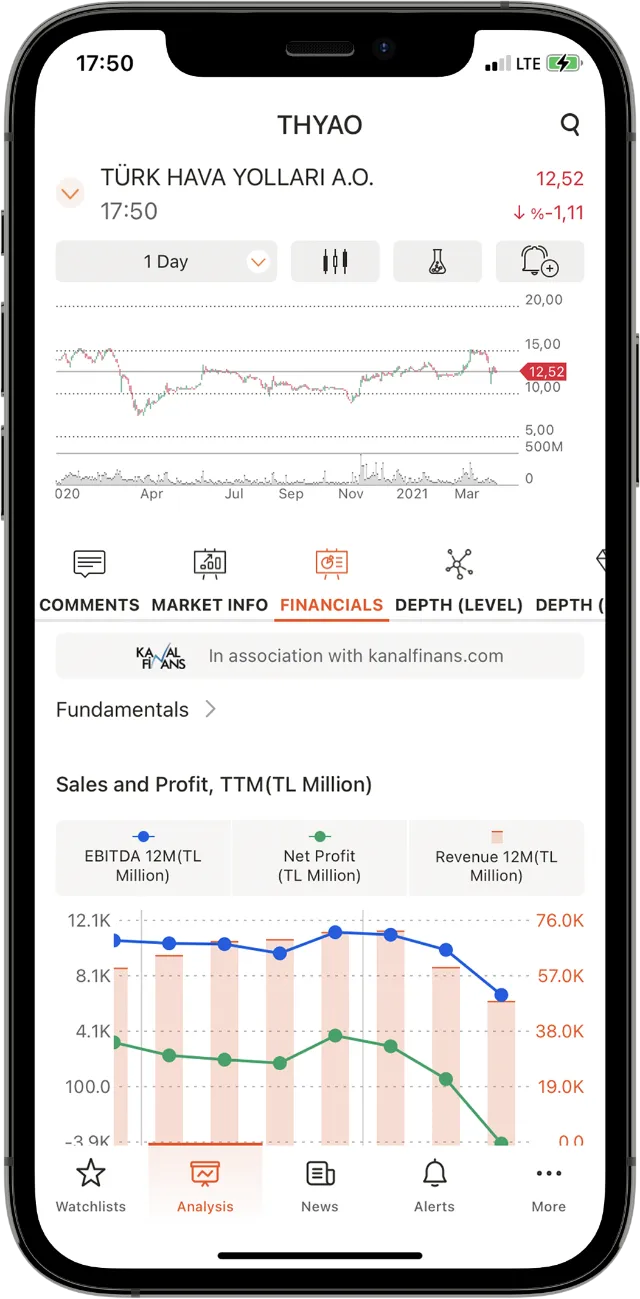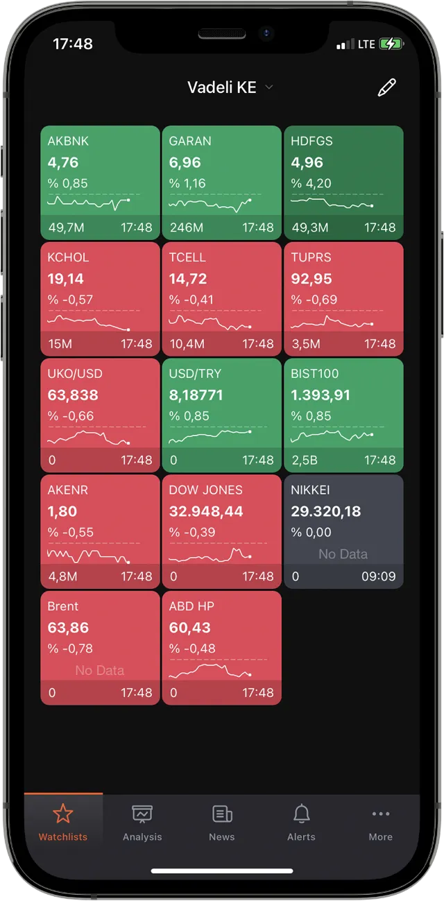 Access to unique fundamentals In-depth underlying quarterly data for each instrument collected in three sections including Ratios (Current Ratio, Liquidity Ratio, Cash Ratio, etc), Income Statement (Revenue, Profit&Loss, Operating Expenses, Operating Profit, etc), and Balance Sheet (Assets and Liabilities). Adjustable price alerts A dedicated Alerts tab to view active and/or canceled alerts and create new alerts. The alerts can be configured so as to be received as push and/or in-platform notifications, with or without expiration time. Customizable watchlists Customizable watchlists for detailed market monitoring: traders can create their own watchlist, modify existing ones, or use public watchlists (BIST 30/100, ETF, etc). Users are free to toggle between tile and list view. All-in-one Analysis page A dedicated Analysis page to study charts, access market statistics, fundamentals & financials with graphs, brokerage analysis, settlement and depth data, and real-time news. Heatmap view In the tile view, watchlists are displayed as heatmaps based on today’s gain/loss, total gain/loss, volume, yield, and P/E ratio.
