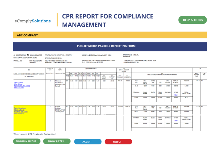 - Automated Certified Payroll Review: Automatically checks all submitted Certified Payroll Reports (CPRs) for non-compliance and flags issues for review.