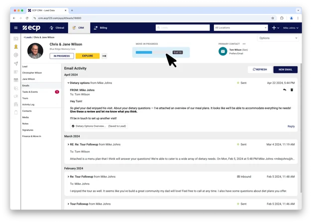 ECP Move-Ins is a dedicated solution for managing the resident admission process in senior living and long-term care communities. It streamlines onboarding workflows, ensures accurate documentation, and improves operational efficiency by centralizing all move-in tasks in one platform.