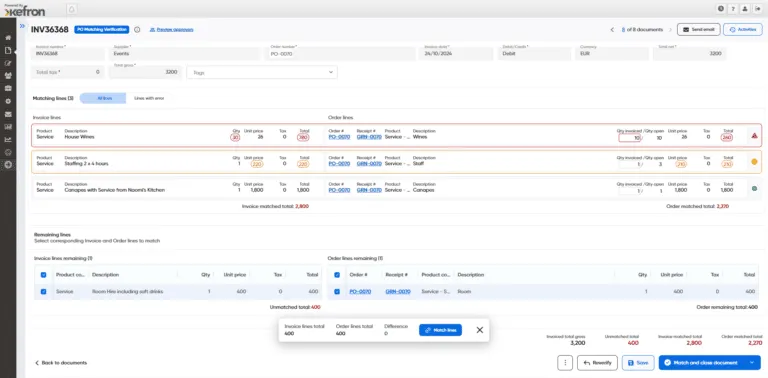 - Digitally matches invoices with contracts, POs, and receipts
