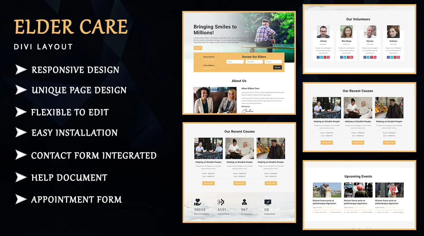 Elder Care is simple and flexible Divi layout page. This layout is suitable for charity, elder care, trust, old age home, health care, Geriatric Care, senior care, senior citizen and nursing home etc.