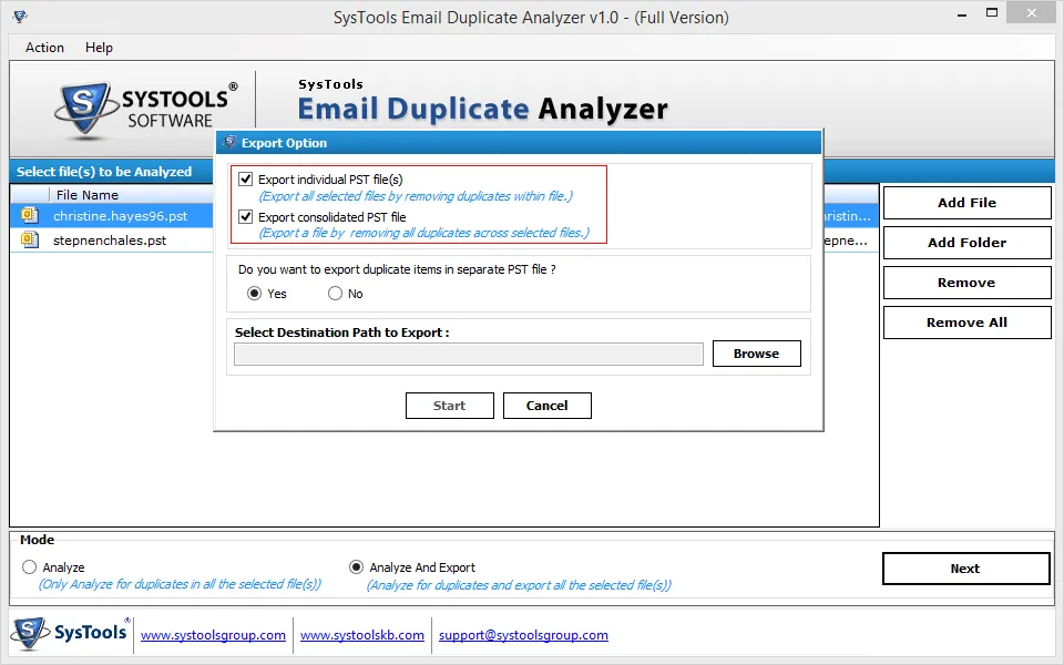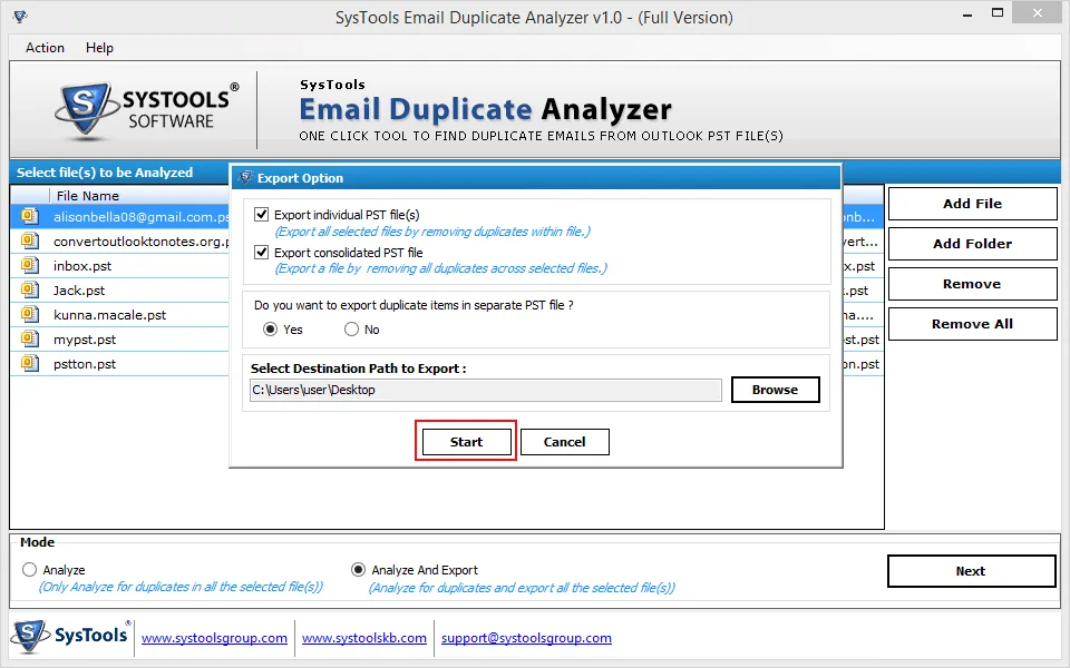 - Offers options to analyze duplicates only or analyze and export PST files.